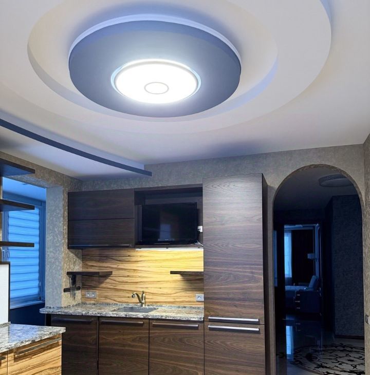 Светлая и объемная кухня-гостиная, из которой открывается панорамные виды на Волгу, закаты и рассветы.