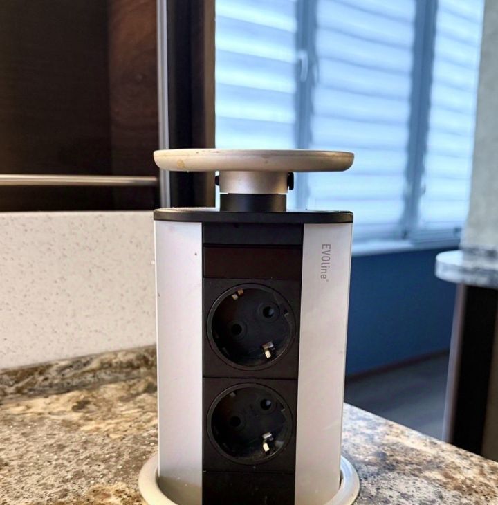 Вся необходимая техника встроена: духовой шкаф, микроволновка, посудомоечная и стиральная машины, холодильник. Розетки в столешнице.