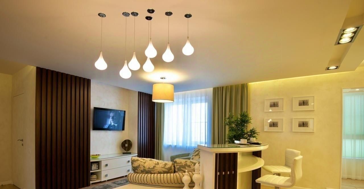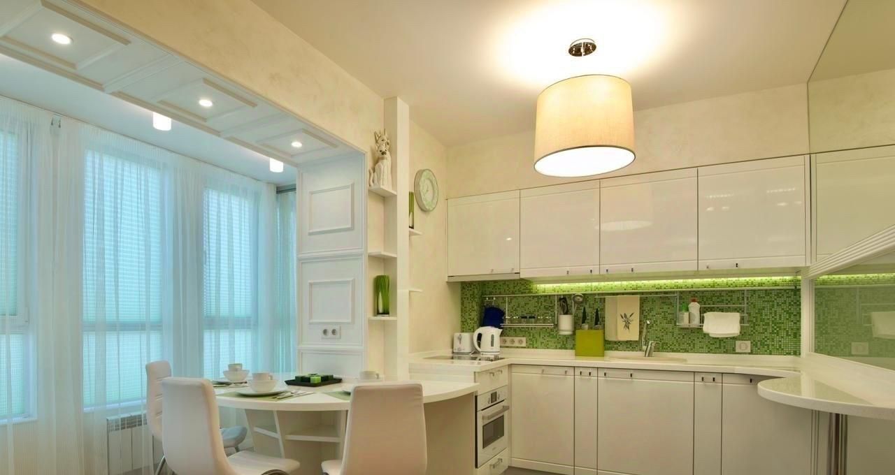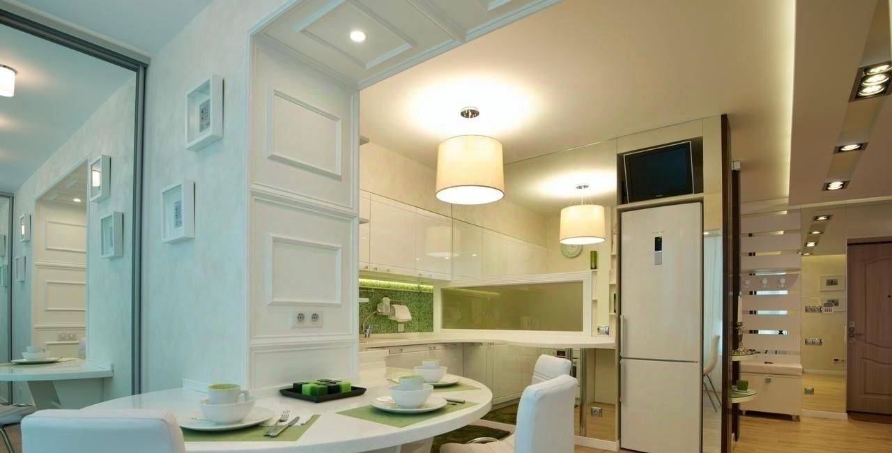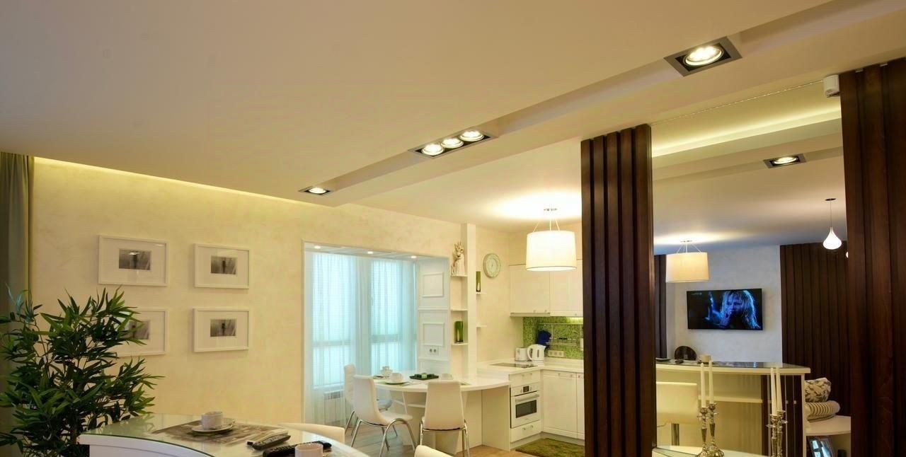 Объединенная кухня-гостинная с барной стойкой и рабочей зоной.