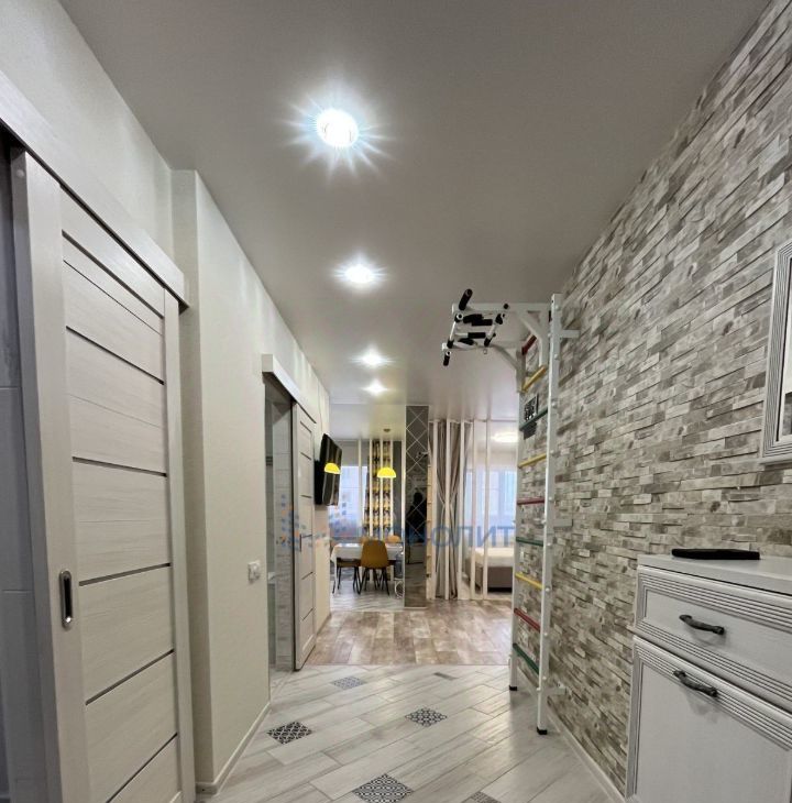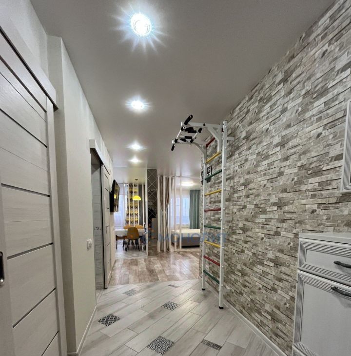 Отлично подойдет для семьи с детьми, одна комната подходит по детскую, а в коридоре стоит детская шведская стенка.