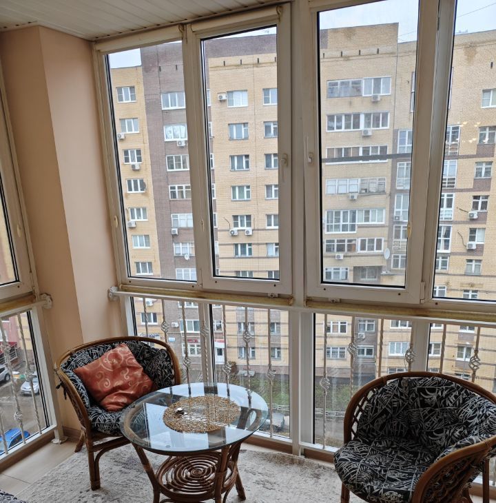Планировка: две изолированные комнаты (спальня, гостиная), отдельная просторная кухня-столовая с выходом на лоджию с панорамным остеклением, раздельный санузел, кладовка.