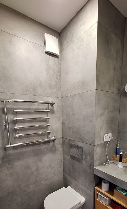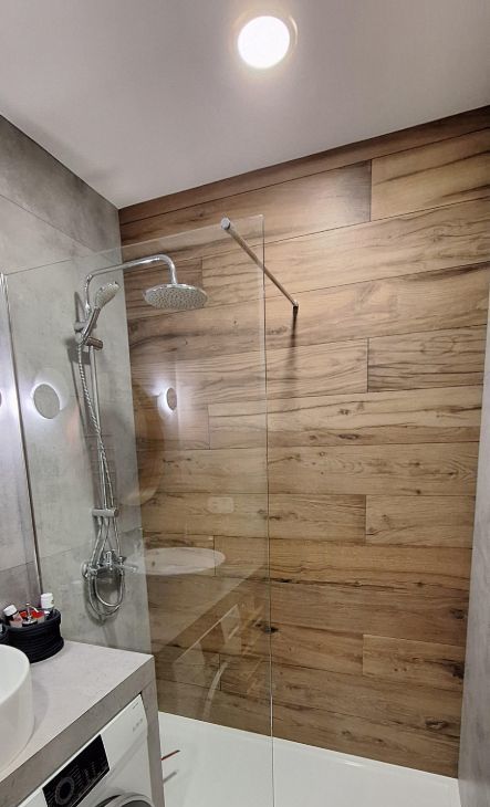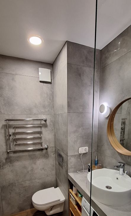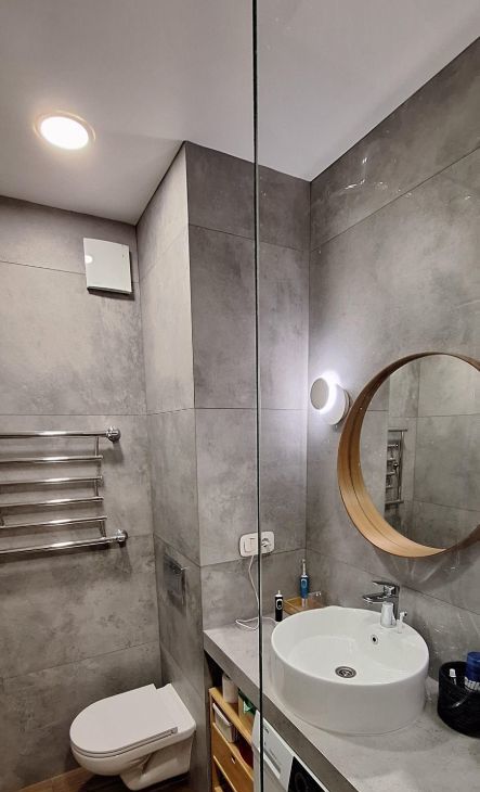 7) в ванной комнате стены и пол укрывает Испанский керамогранит Italon, установлена инсталляция и сместители am pm, душевая зона open space.