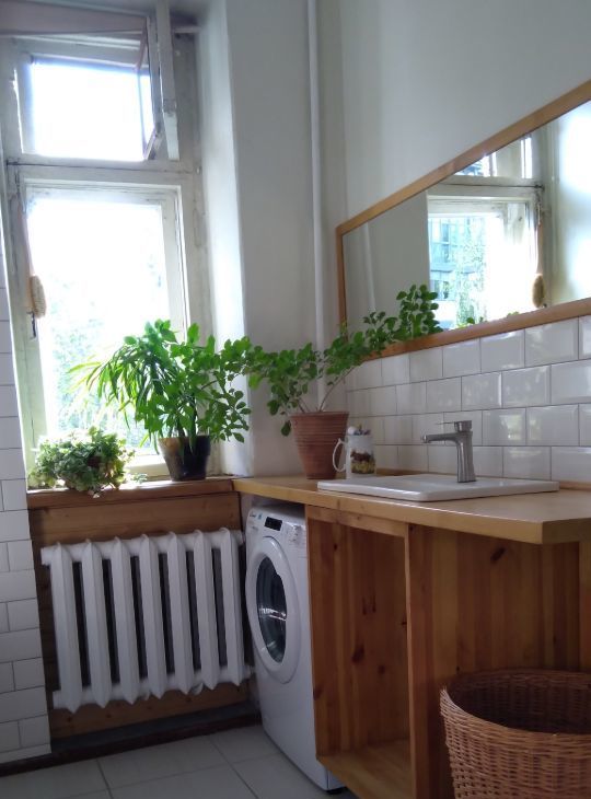 Прекрасная ванная комната с окном. Есть необходимая мебель и техника (телевизор, стиральная и посудомоечная машины, холодильник, индукционная плита).