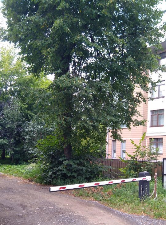 Парковка во внутреннем дворе за шлагбаумом.