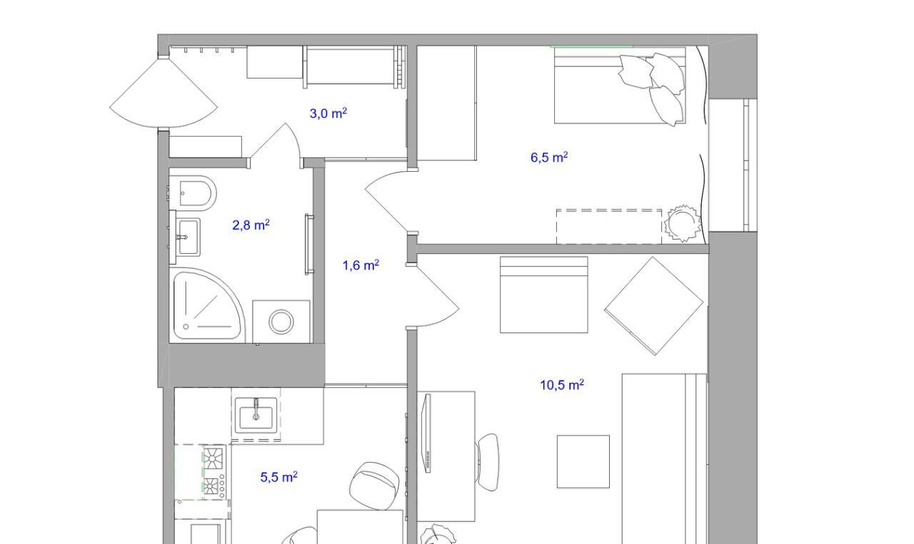 Общая площадь 30,9 м²: комнаты 10,5 и 6,5 м², кухня 5,5 м², совмещенный санузел, застеклённый балкон.