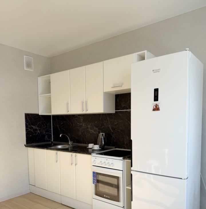 Просторная кухня-гостиная площадью более 15 кв.м станет сердцем вашего дома, где уже есть кухонный гарнитур, плита, холодильник и полноценная обеденная группа.