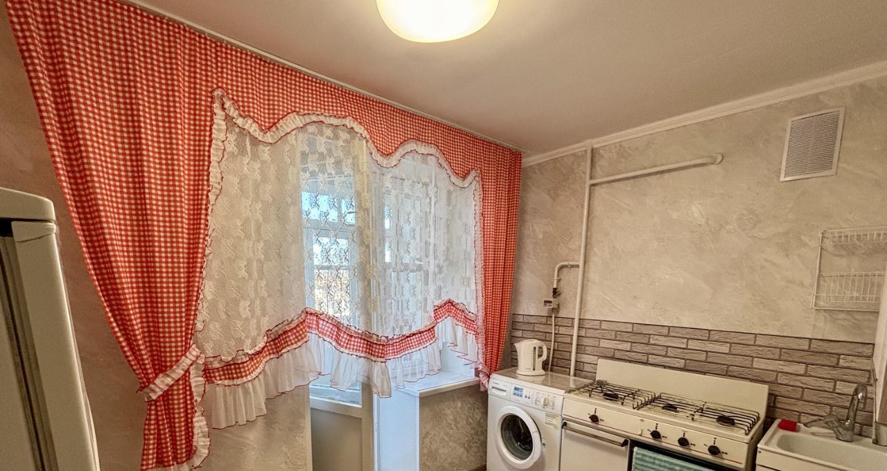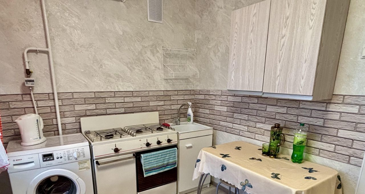 Кухня оборудована необходимой техникой, включая холодильник и стиральную машину. Из мебели есть диван и шкафы для хранения вещей.