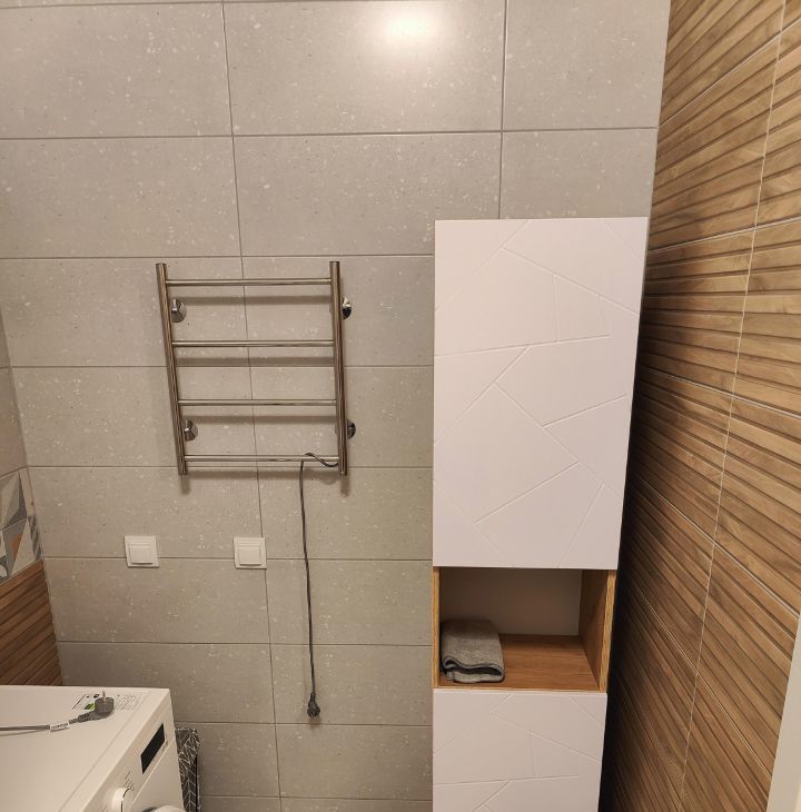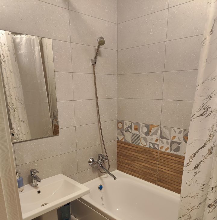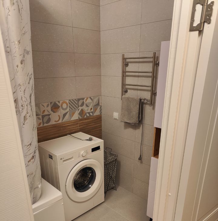 В квартире есть все необходимое для комфортного проживания: современная мебель в комнате и на кухне, а также полный комплект бытовой техники — холодильник, посудомоечная и стиральная машины, телевизор. Ванная комната оборудована ванной. Просторная лоджия.