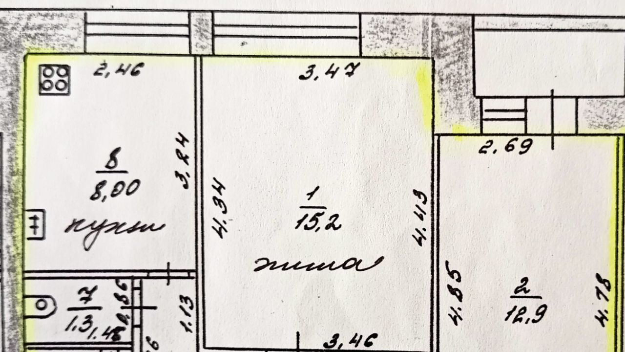 Общая площадь квартиры - 47,7 кв. м., дополнительно лоджия из спальни 2,4 кв.м. Жилая 28,1 (15,2+12,9) кв. м., кухня 8 кв.м. Без перепланировок.