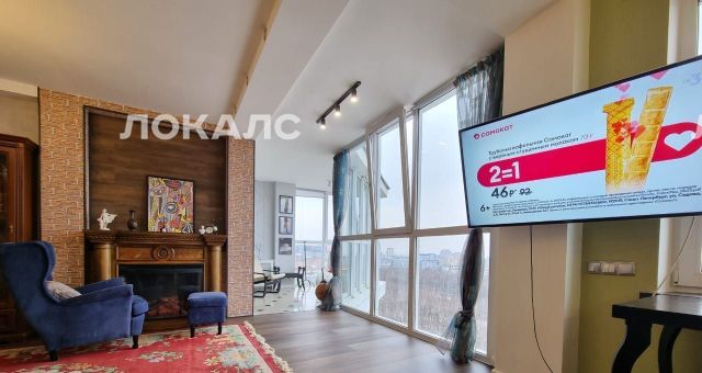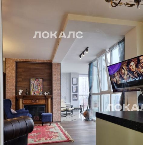 В квартире спальня и кухня-гостиная с камином и современным смарт-телевизором. Есть также остальная необходимая бытовая техника.