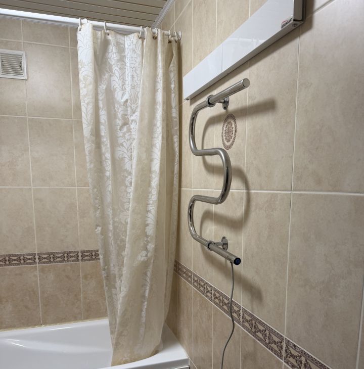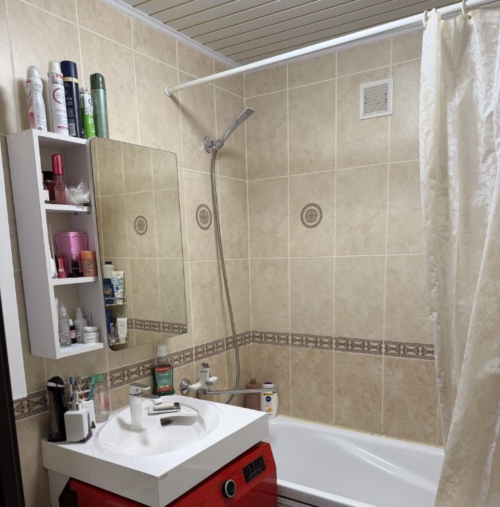 Ванная комната стала функциональнее: Заменена плитка, а продуманное решение с раковиной над стиральной машиной позволило оптимизировать пространство и сделать его более эргономичным.