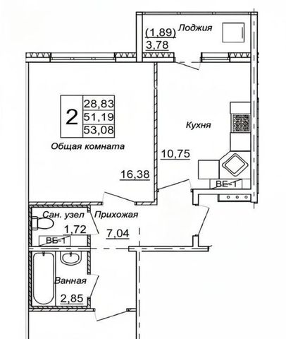 Кухня (10.8 м²), Гостиная (16.4 м²), Спальня (12.5 м²), Раздельный санузел, Лоджия.