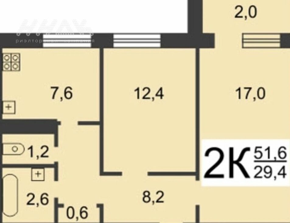 Кухня- 7,6 кв.м. Комнаты 12 и 17 квм. Комната изолированные, имеется просторная лоджия, выход на которую из комнаты.
