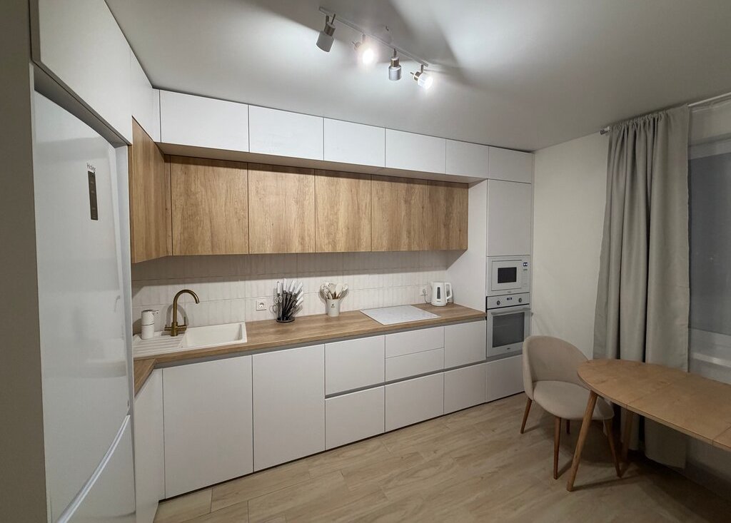 В комплекте: холодильник, индукционная варочная панель, духовой шкаф, встраиваемая микроволновая печь, стиральная машина, телевизор (диагональ 65 дюймов)