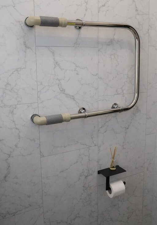 Пол - керамогранит. Стены - панели под плитку. Потолок натяжной с диодной люстрой, есть полотенцесушитель.