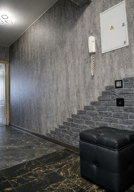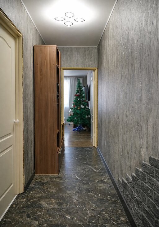Пол керамогранит с тёплым полом (управление находится в прихожей). Потолок - натяжной с диодной люстрой. Стены: обои и гипсовый камень. Коридор - ламинат, стены: обои, потолок натяжной с ещё одной диодной люстрой