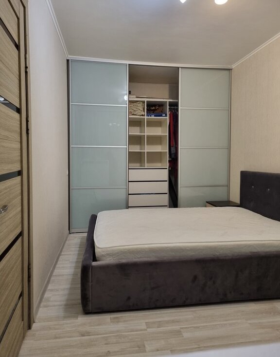 В спальне — большая двуспальная кровать и гардеробная, детская кровать, детский комод.