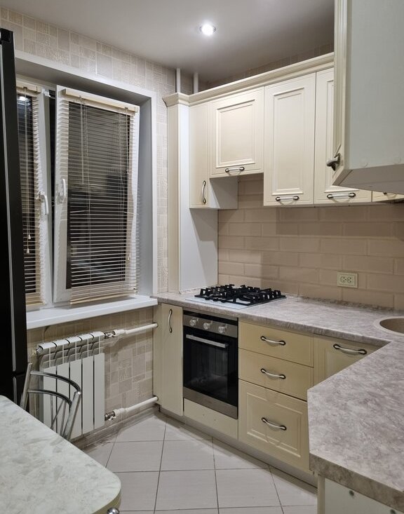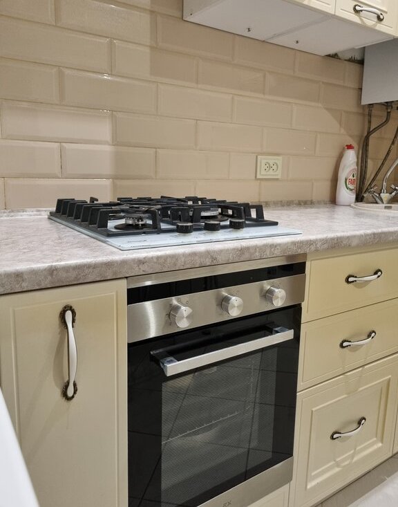 Кухня оборудована современной техникой: газовая плита, духовой шкаф и холодильник.