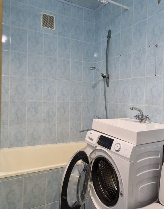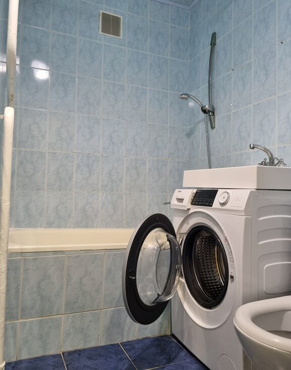 Ванная комната совмещена, оснащена ванной, стиральной машиной, раковиной , туалетом.