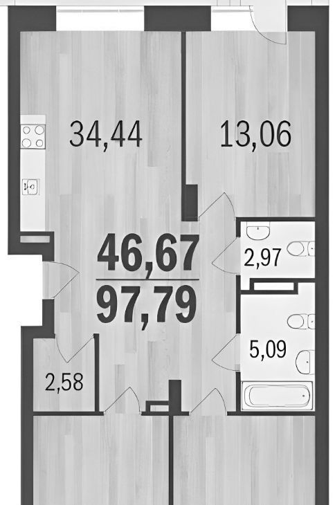 В квартире 2 полноценных санузла. Третья комната пока пустая, комплектуется под арендатора.