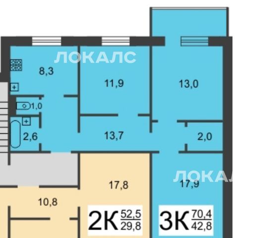 - Комнаты изолированные - 11,9 кв.м, 17,9 кв.м. и 13 кв.M.