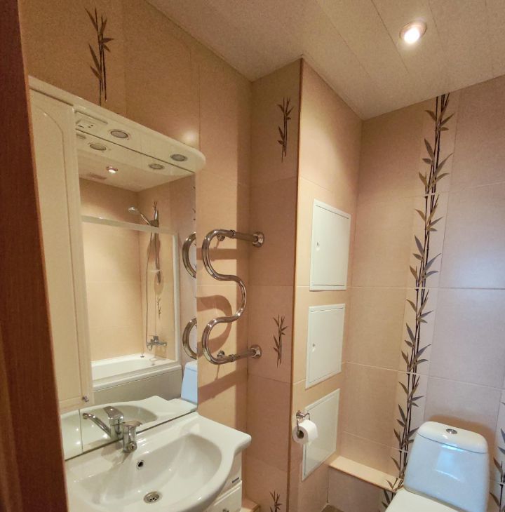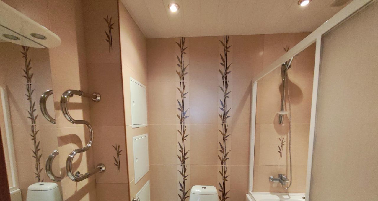 В квартире есть один совмещённый санузел, установлены ванна и отдельно душевая кабина. Окна выходят как во двор, так и на улицу, поэтому в квартире всегда светло и уютно. Мебель есть как на кухне, так и в комнатах, а из техники — кондиционер, холодильник, телевизор и стиральная машина. Также имеется лоджия, где можно устроить зону отдыха.