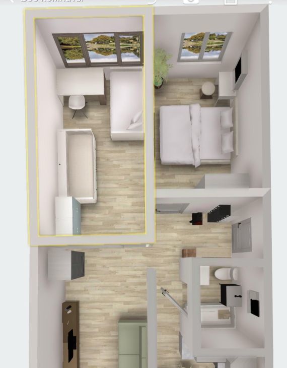 Квартира очень теплая. Окна выходят на разные стороны дома. Имеется 3Д план расстановки мебели (скрин на фото)