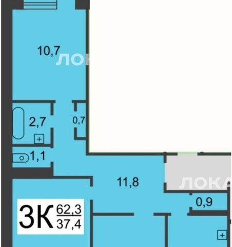Удачная планировка: нет проходных помещений, просторная прихожая, раздельный санузел. Общая площадь квартиры — 62,3 кв. м, жилая — 37,4 кв. м, кухня — 7,7 кв. м. Три изолированные комнаты с площадью 17,2, 10,7 и 9,5 кв. м. Высота потолков — 2,5 м. Есть небольшая кладовая и лоджия. Тамбур на 2 квартиры.