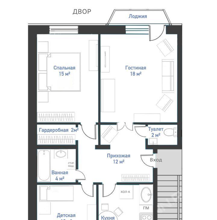 - гостиная 18м² c лоджией;