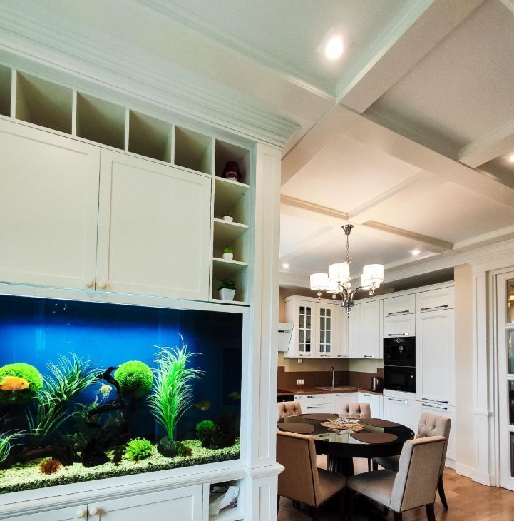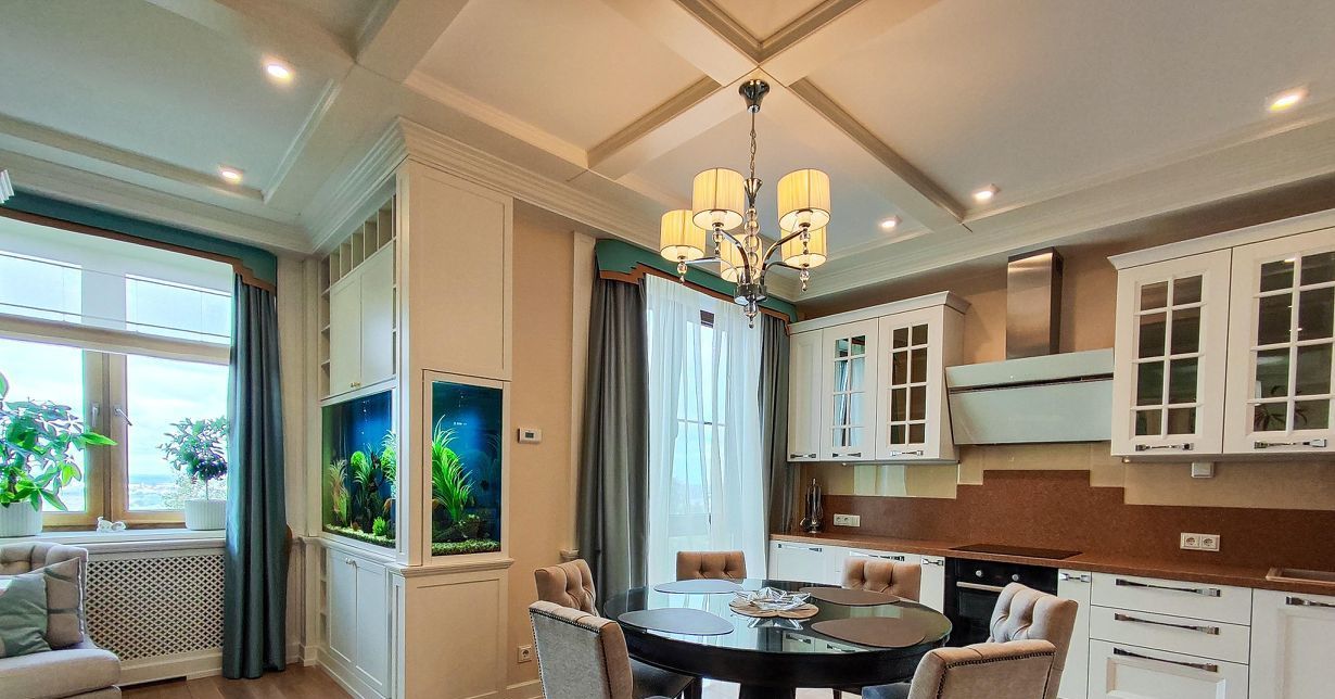 Большая кухня-гостиная со всем необходимым оснащением (посудомоечная машина, микроволновка, духовой шкаф, кофемашина, красивая столовая посуда на 12 персон
