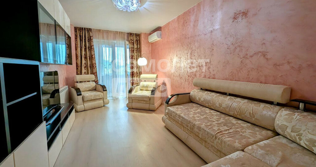 В комнатах – двуспальная кровать и раскладывающийся диван. Телевизор, стиральная машина, бойлер (на время отключения горячей воды), кондиционер. Большая гардеробная. Утеплённая лоджия с видом на ТЦ "Небо".