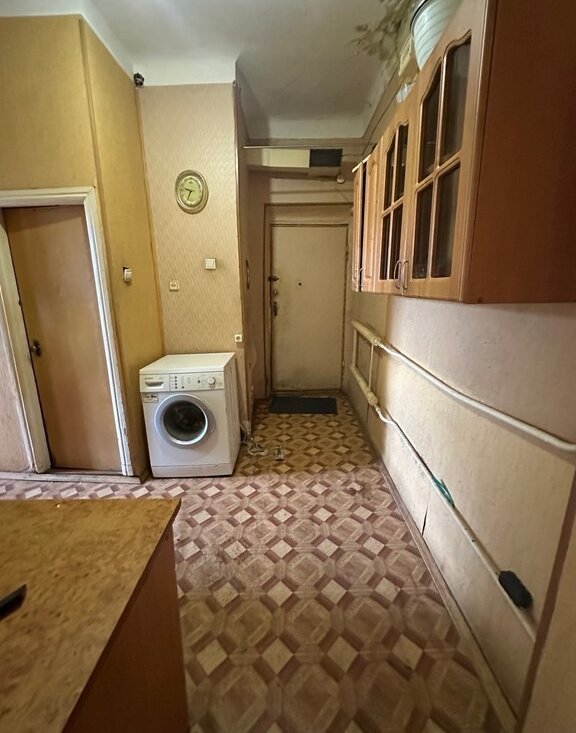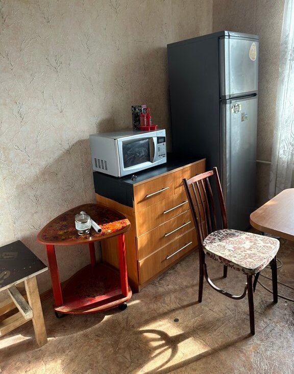 Кухня площадью 8 м² оснащена необходимой техникой: холодильник, плита, микроволновая печь и стиральная машина. Из мебели — шкафы и обеденный стол. Санузел совмещённый, оборудован ванной и раковиной.