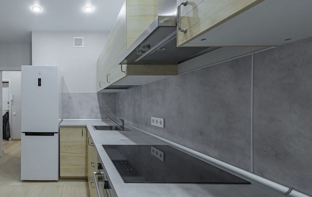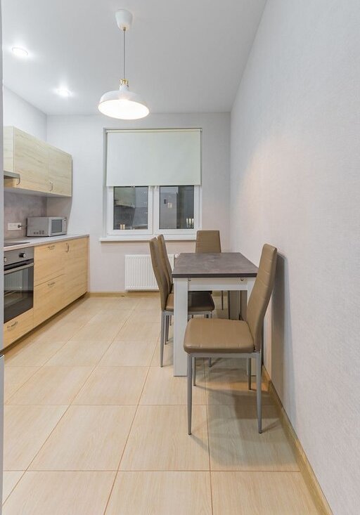 - Кухня полностью оборудована кухонным гарнитуром, холодильником, посудомоечной машиной,индукционной плитой, столом, стульями и микроволновой печью.
