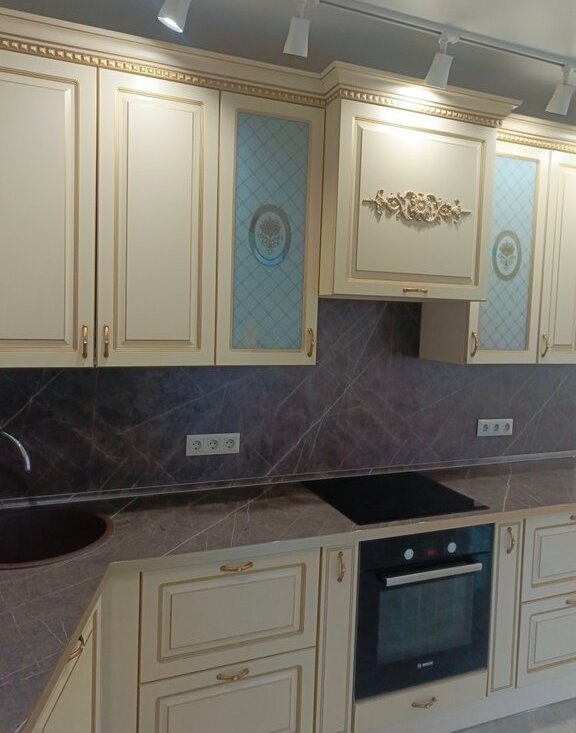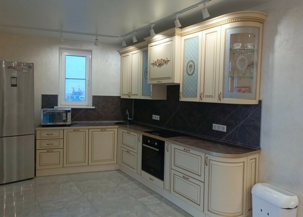 Квартира продается с кухонным гарнитуром Evita в классическом стиле со встроенной техникой европейских брендов (посудомоечная машина и духовой шкаф Bosch, индукционная варочная панель Electrolux, холодильник Siemens) и встроенными шкафами купе..