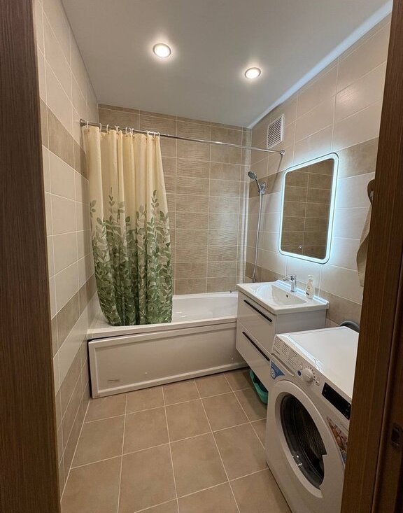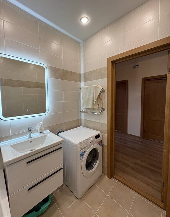 Ванная: Помимо стандартного набора ванна, раковина, тумба, так же установлена вместительная стиральная машина на 8 кг и стильное зеркало с подсветкой.