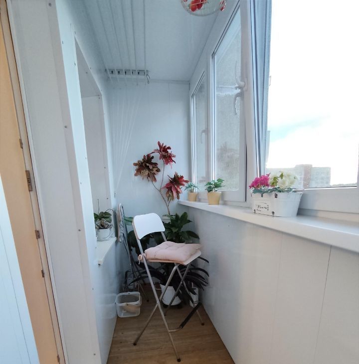 Большой застеклнный балкон на кухне, в комнате лоджия с тёплым полом.
