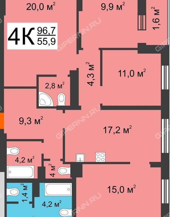 4-комнатная квартира: Нижний Новгород, проспект Героев Донбасса, 1 (97 м²)