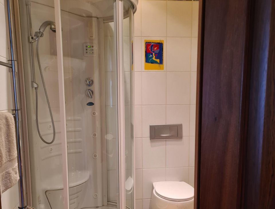 Две ванные комнаты совмещённые, с ванной и душевой кабиной, боллер для подогрева воды, стиральная машина.