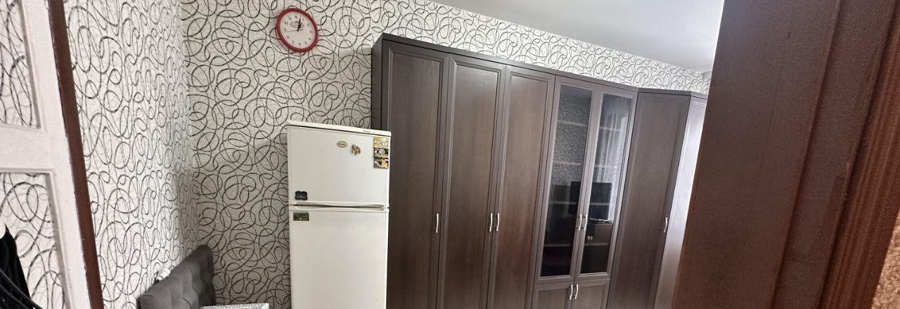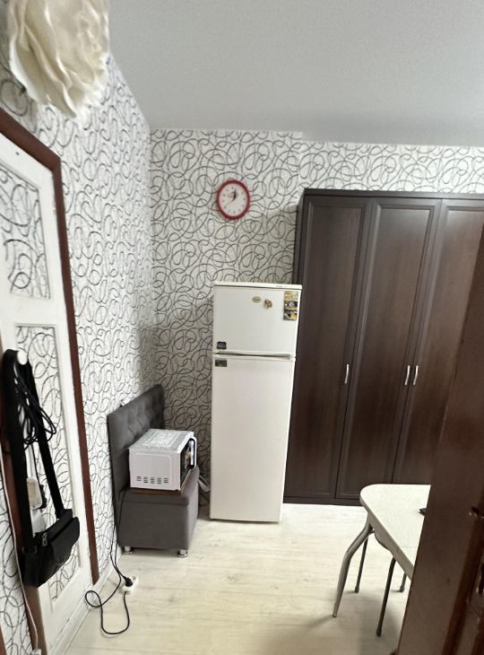Комната 13.3 кв. м. Диван, большой вместительный шкаф в комнате и в прихожей, холодильник, телевизор, микроволновка, столик, тумба, стиральная машина.