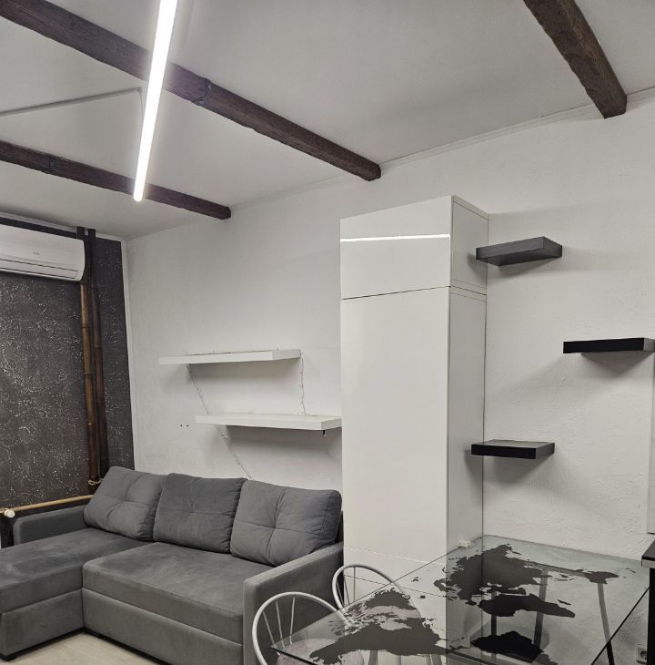 В квартире выполнен дизайнерский ремонт. Здесь вы найдёте всё, что нужно для жизни: современная мебель на кухне и в комнате, техника — кондиционер, холодильник, телевизор и стиральная машина. Планировка студии продумана до мелочей, совмещённый санузел оборудован ванной. Из окон открывается вид как на улицу, так и во двор, а наличие лоджии добавляет дополнительное пространство для отдыха.
