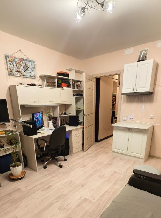 Продается большая уютная студия с косметическим ремонтом в панельном доме 2021 года постройки. Просторная комната площадью 13,2 м² включает зону отдыха с диваном и рабочим местом. Из окон открывается вид на тихий двор. В квартире просторный 5.1 кв.м совмещенный санузел, оборудован современной сантехникой.