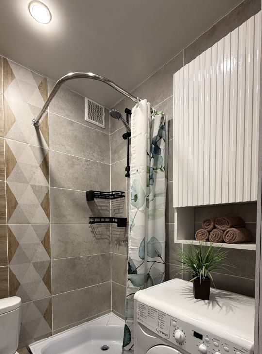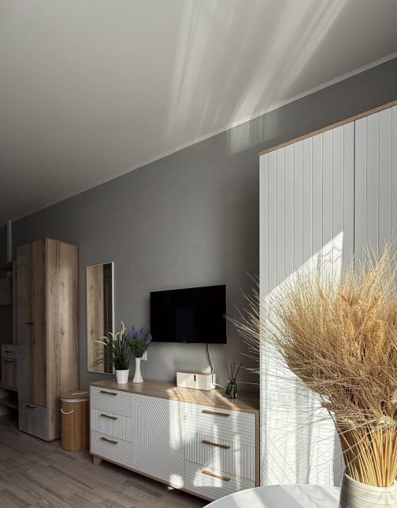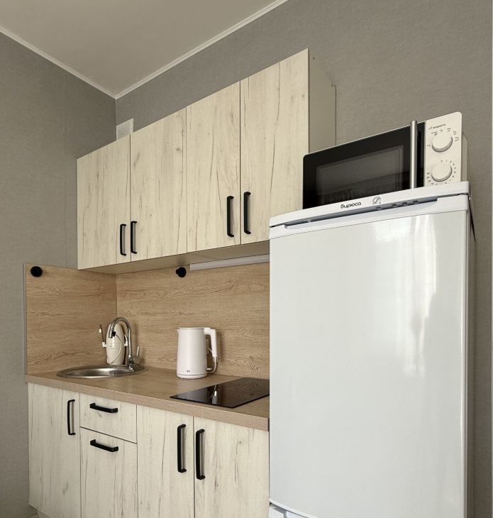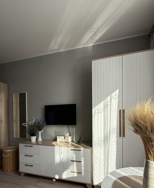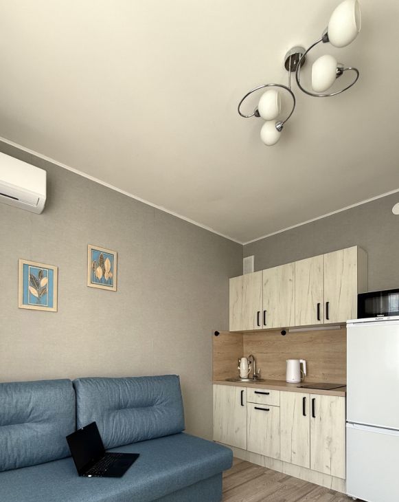Есть все для комфортного проживания - шкафы (много место для хранения, что редко встречается в студии), 2x-спальный диван, кухонный гарнитур, стол, стулья, полноразмерный холодильник, стиральная машина, электрический чайник, телевизор, микроволновка, варочная панель, кондиционер, сушилка для белья, гладильная доска, пылесос, кухонная посуда и приборы.