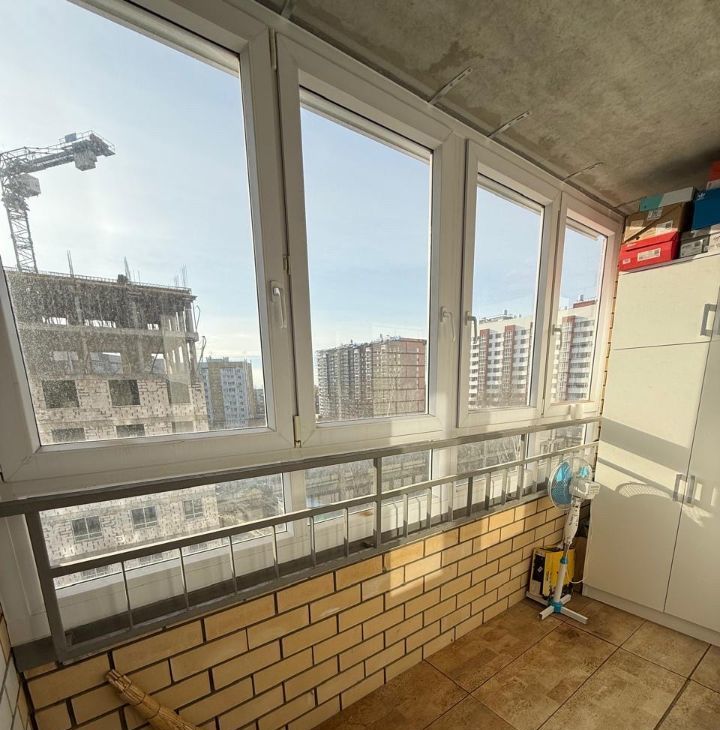 Квартира с лоджией, на ней есть дополнительный шкаф для хранения вещей.