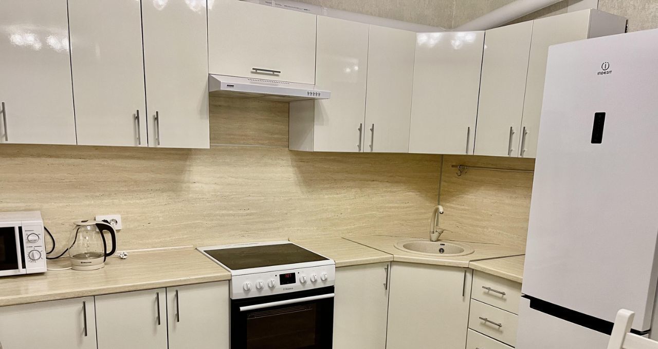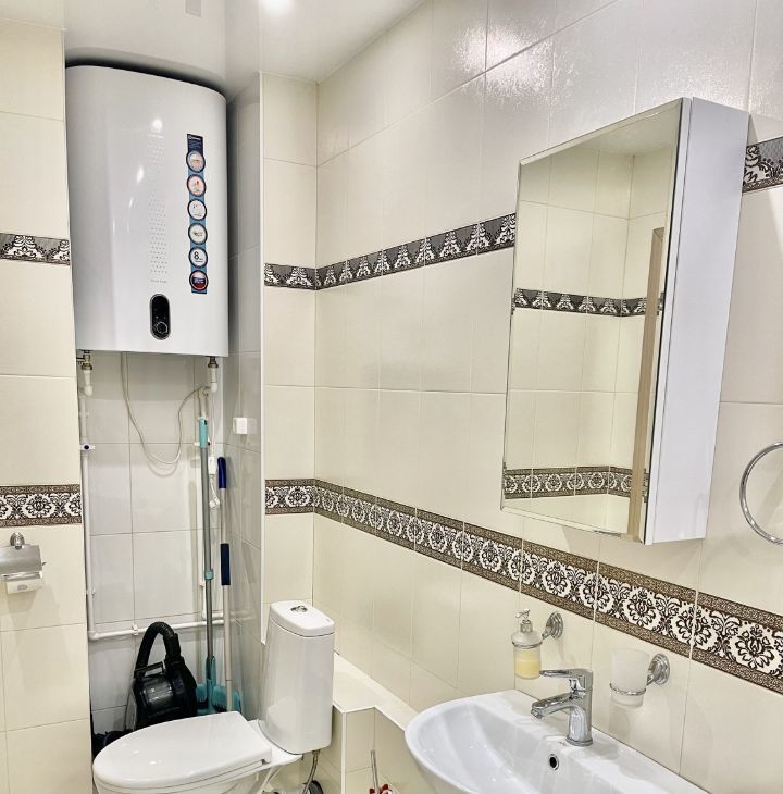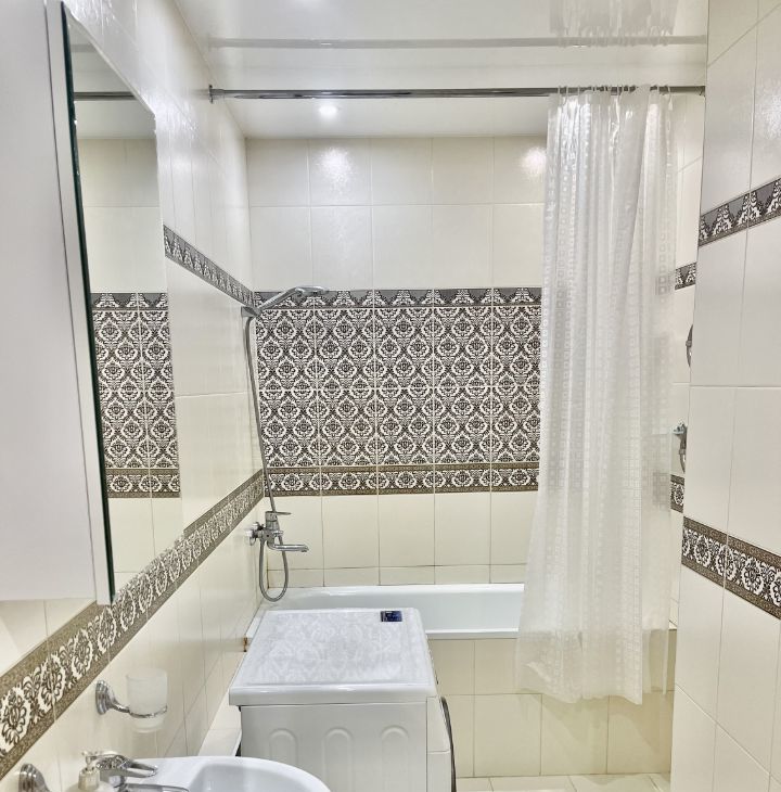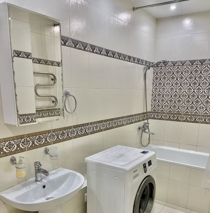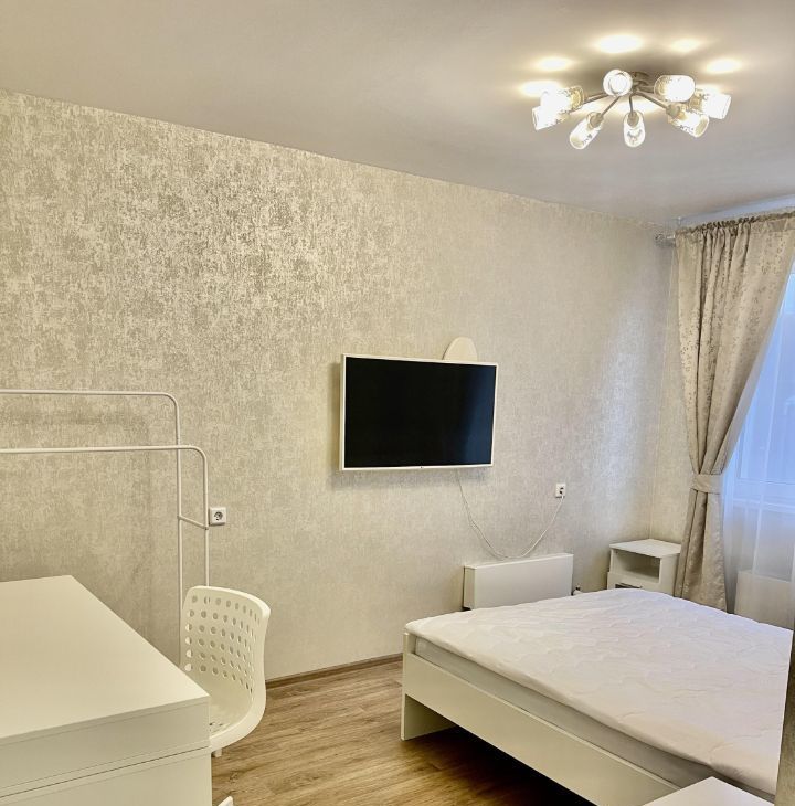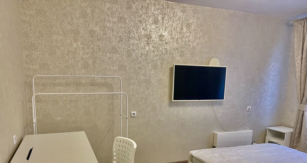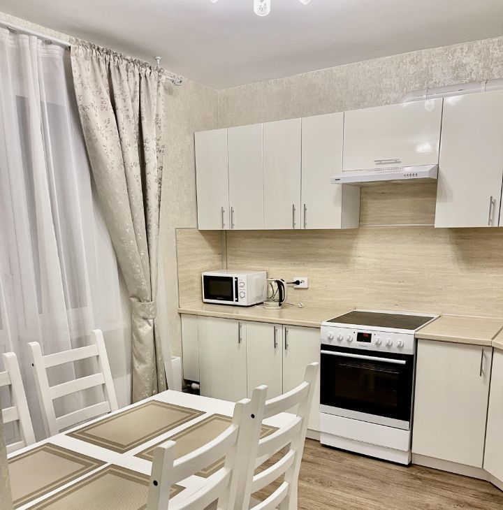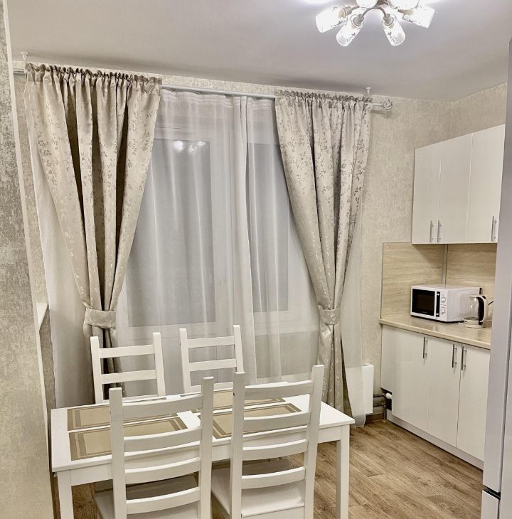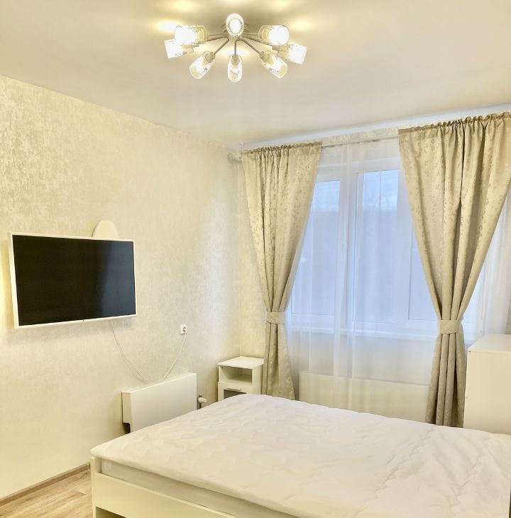 Имеется всё необходимое для комфортного проживания: большой кухонный гарнитур, холодильник full no frost, стеклокерамическая плита, микроволновая печь, вытяжка, кухонный стол, стулья, двуспальная кровать, прикроватные тумбы, письменный стол, стул, комод, огромный шкаф-купе, телевизор диагональю 43" (109.2 см), шторы. Ванная комната полностью выложена плиткой, установлен водонагреватель объемом 80л., стиральная машина. Вся мебель и техника остаются новым хозяевам. Квартира очень светлая, чистая и уютная.