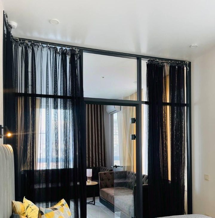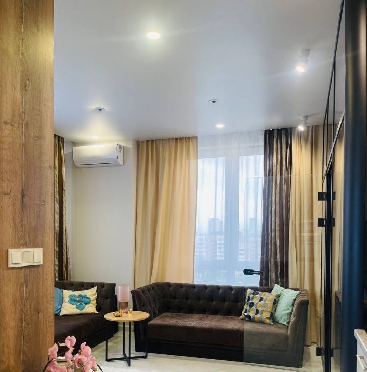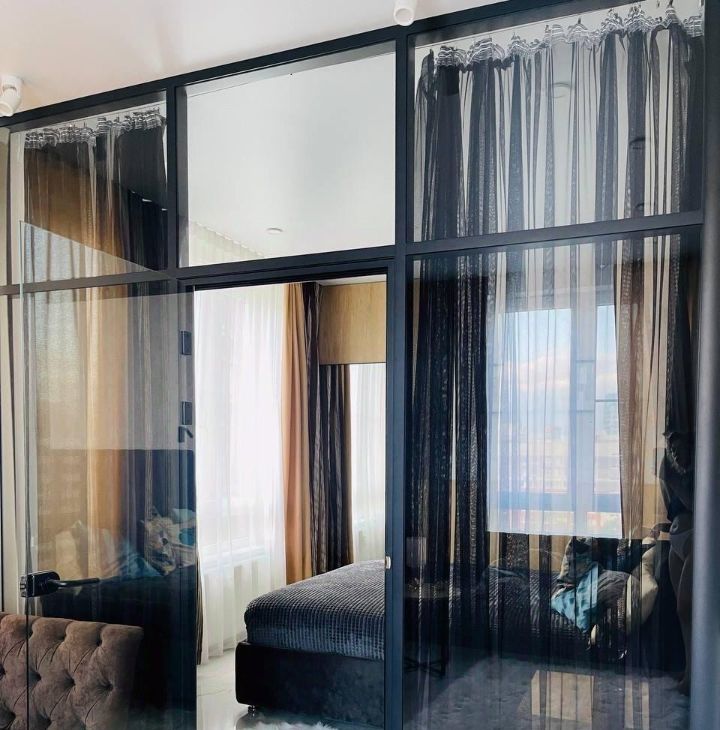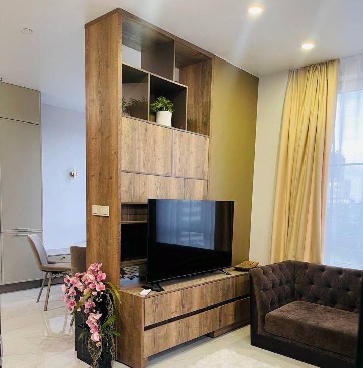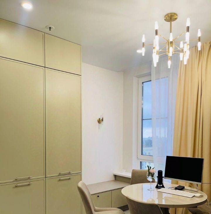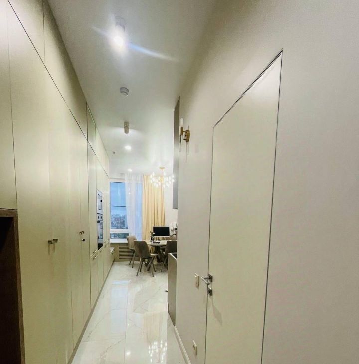 Дизайнерский ремонт, апартаменты укомплектованы всем необходимым для комфортного проживания, вся мебель сделана на заказ, огромное количество шкафов и полок, светильников и ламп, неоновая подсветка в спальне и на кухне, белый мраморный пол, квартира изначально была студией, но выполненная на заказ стеклянная стена-перегородка отделила спальню от гостиной, которая в свою очередь плавно переходит в кухню, при этом другая перегородка отделяет гостиную от кухни.