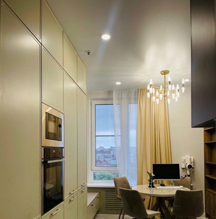 Квартира оснащена кухонной встроенной техникой NEFF (индукционная плита, микроволновка, посудомоечная машина, холодильник, духовой шкаф), всей необходимой посудой и столовыми приборами, стиральной машинкой-сушилкой