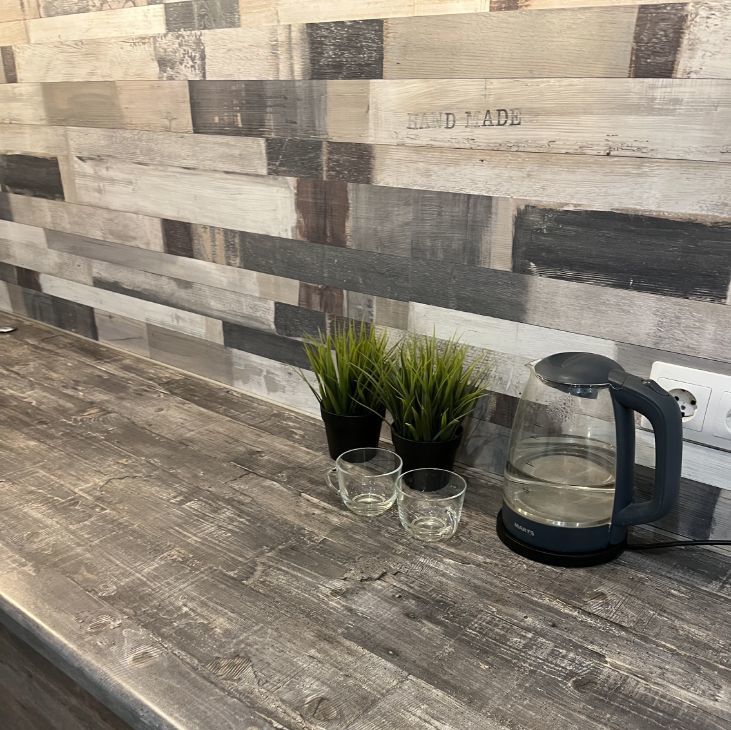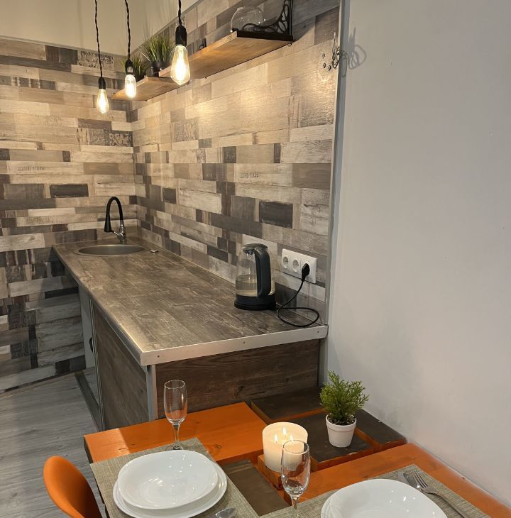 Полностью оборудованная кухня: плита, холодильник, микроволновка