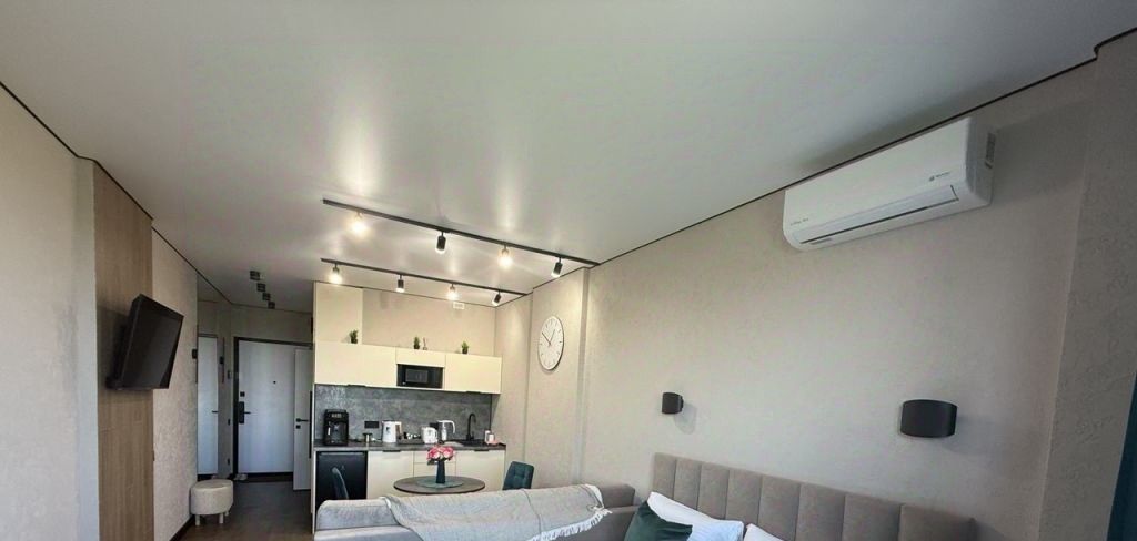 В квартире есть все необходимое для проживания: двухспальная кровать с матрацем Аскона, раскладной диван, телевизор, кондиционер, кухонный гарнитур с техникой и посудой, мини холодильник, кухонный стол и стулья, шкаф, стиральная машина.